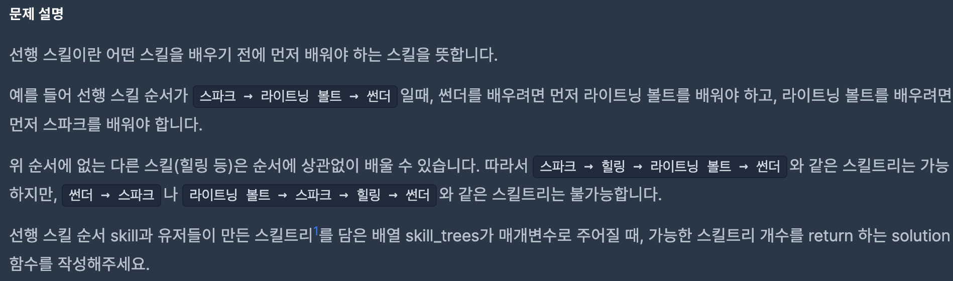 checkTree메서드 활용skill_trees의 객체인tree를 한단어씩 순회하며skill에서 인덱스를 찾는다.- 인덱스가 없으면 무시