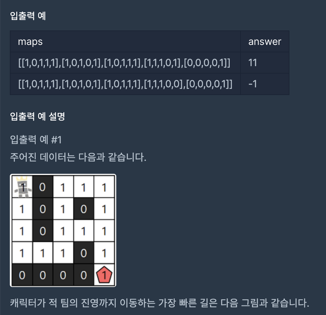 maps[n-1][m-1]에 최단 거리가 저장됨- 여전히 1이면 방문 못했다는 뜻 → 1