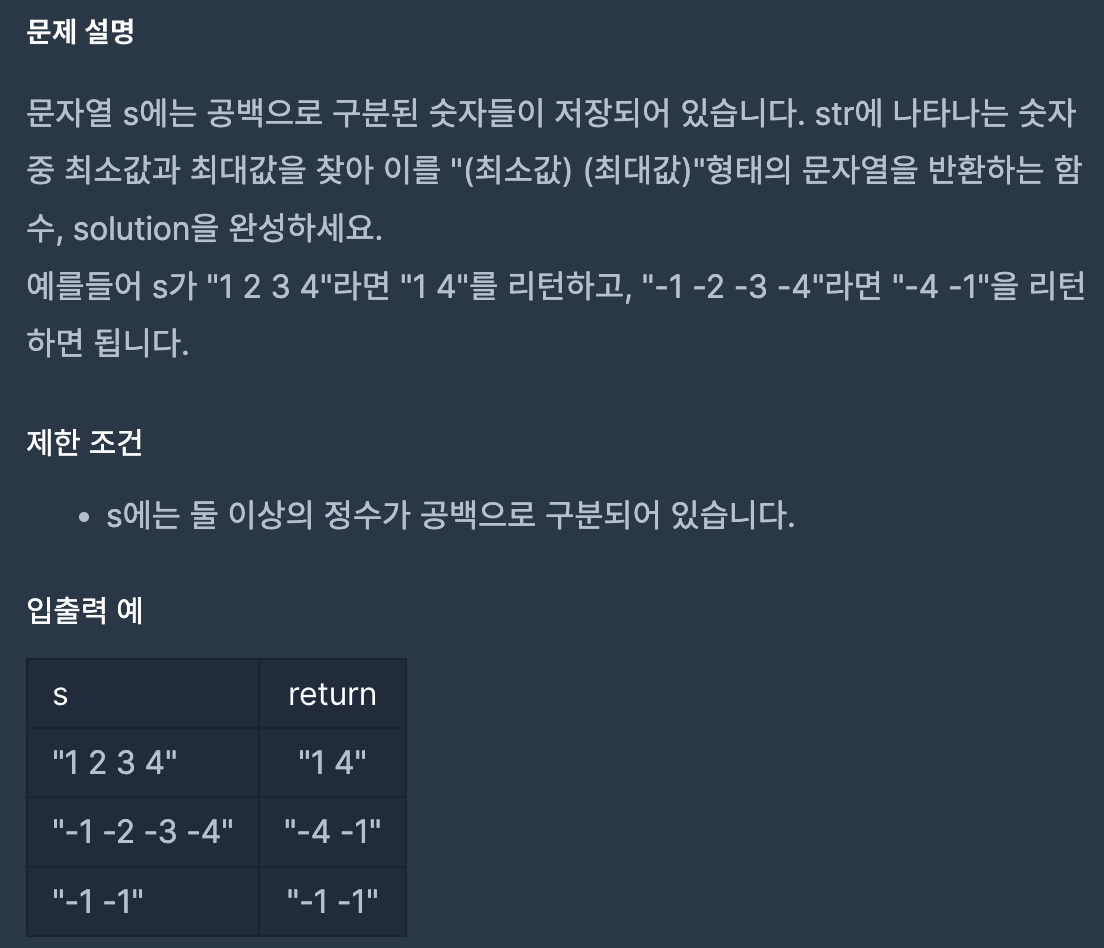 split()을 활용하여 공백 기준으로 나누어 배열에 저장한다.- min과 max 값을