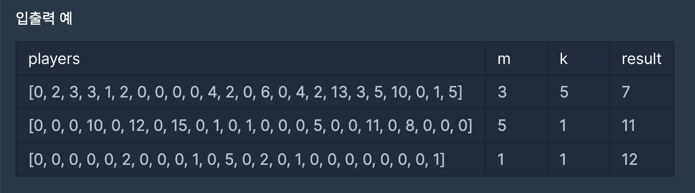 public int solution(int[] players, int m, int k) {
