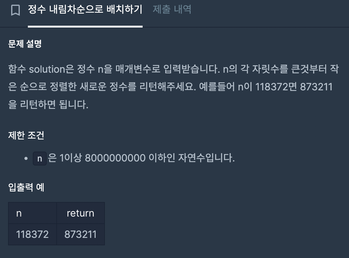 String.valueOf(n): Long 타입 n을 String으로 변환toCharArray(): String 타입 n을 Char 타입으로 변환Arrays.sort(): Char 타입 배열이므로 sort() 사용하여 오름차순 정렬StringBuilder사용하여 수정 가능하게 만든 후,reverse(): 역으로 정렬 ➡️ 내림차순 정렬Long.parseLong(): Long 타입 변환toString(): StringBuiler 객체 내용을 String으로 변환하여 보여줌