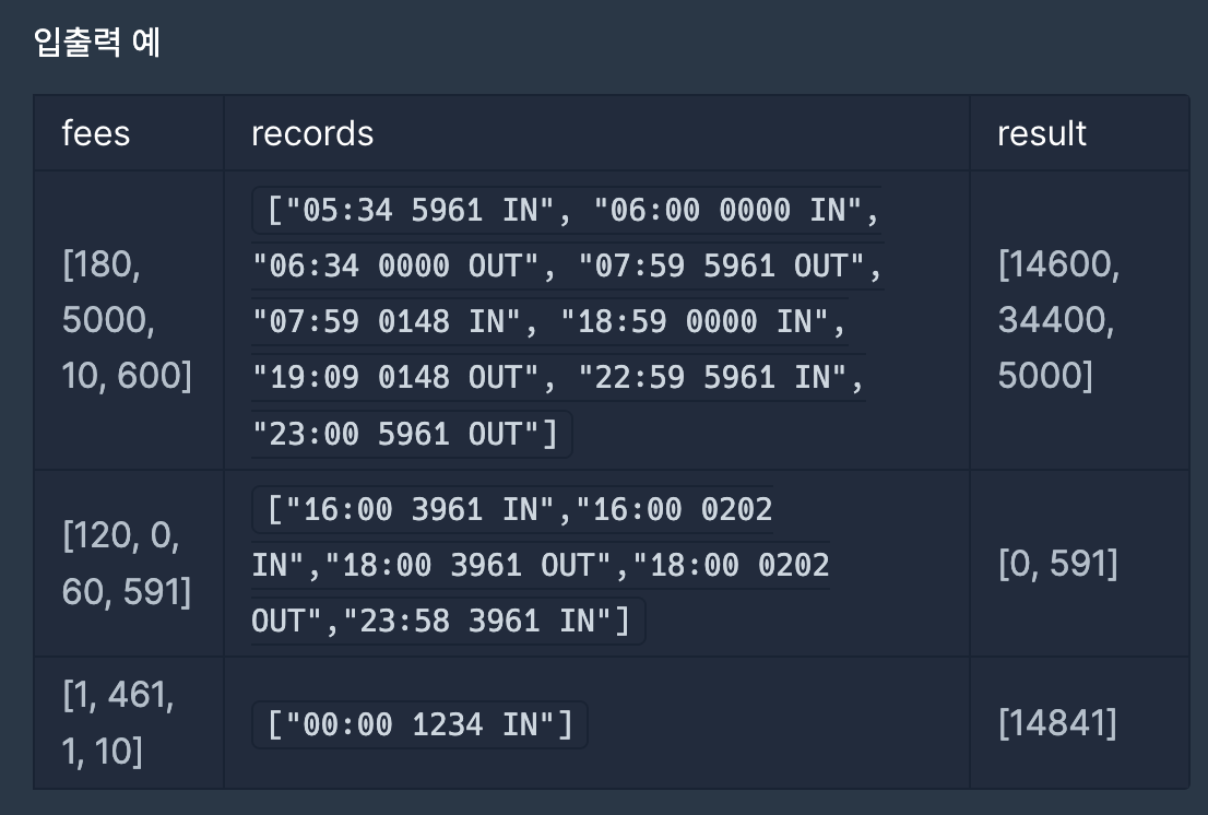 이번 문제는 차량별 누적 주차 시간을 구하고, 그 시간에 따라 요금을 계산하는 것이 핵심입니다.