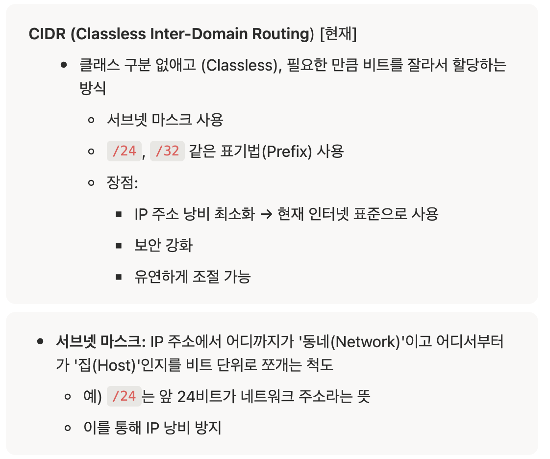 → 현대 네트워크는 CIDR(Classless Inter-Domain Routing) 방식 사용