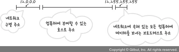 예) 클래스 A → 12.0.0.0 네트워크 부여