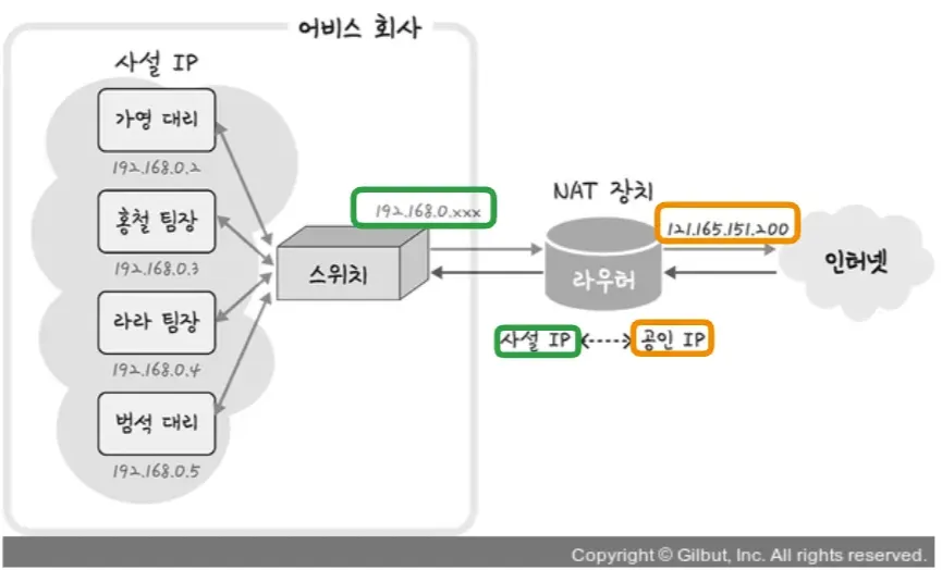 - 홍철 팀장과 가영 대리는 하나의 IP인 `121.165.151.200`을 기반으로 각각의 다른 IP를 가지는 것처럼 인터넷을 사용 가능